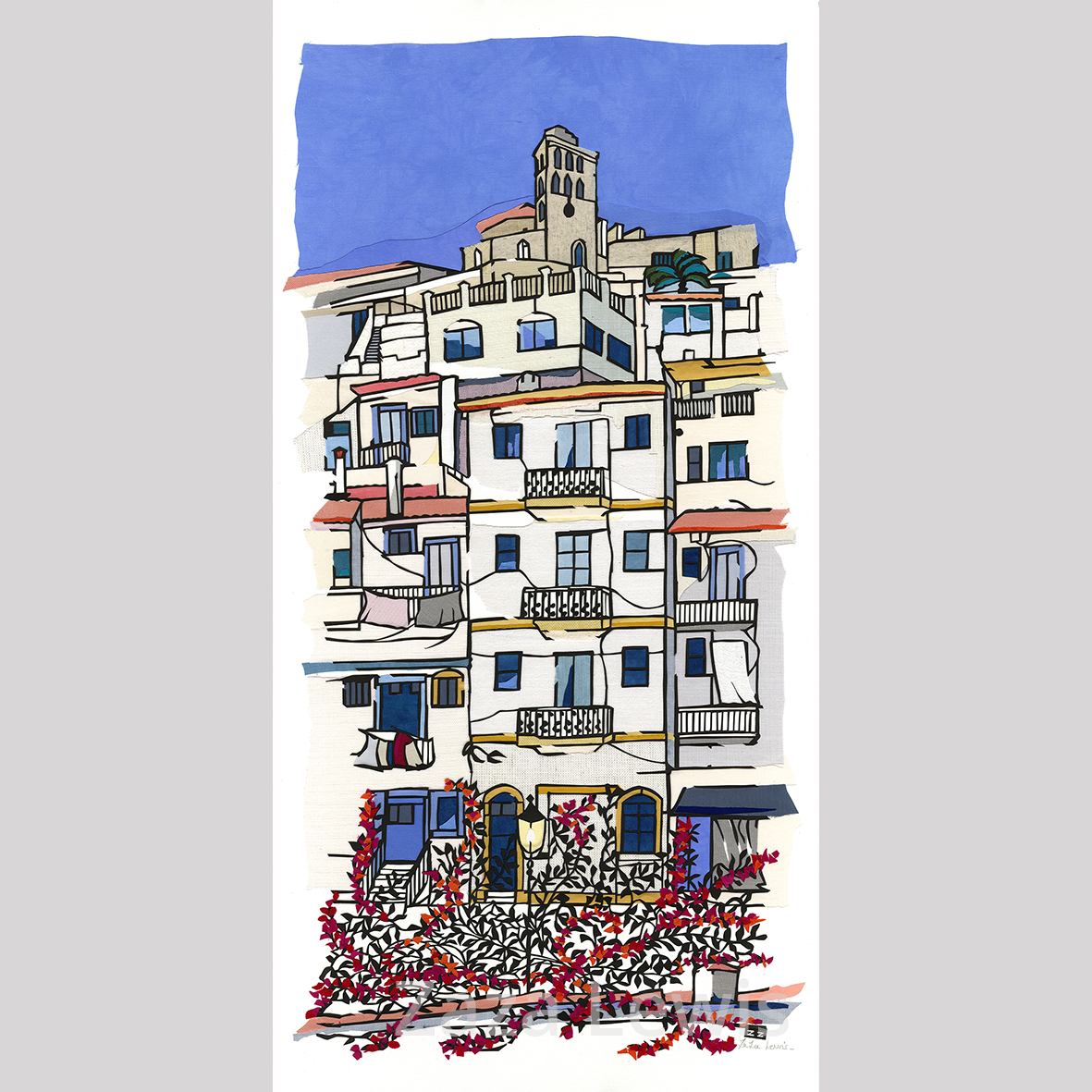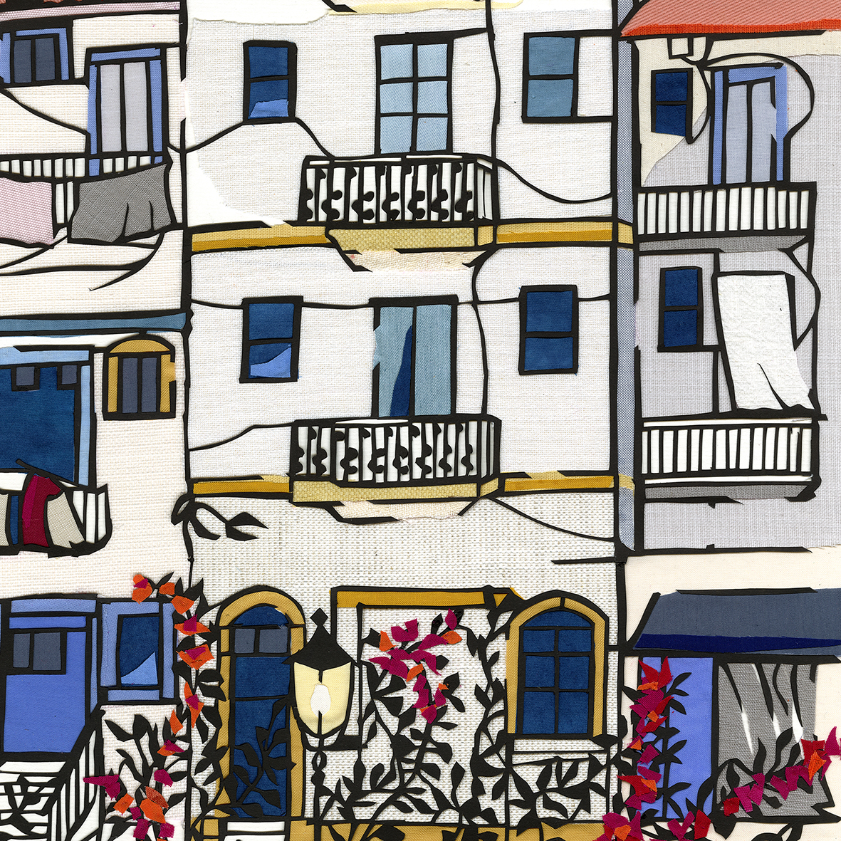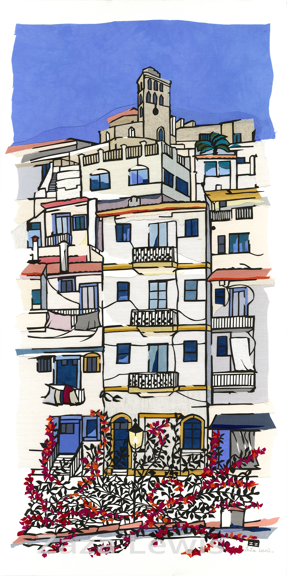 This is part of my Street Collection and was inspired by the old town of Ibiza (Spain), with the bougainvilliers in full bloom and poetic disorder along the white wash wall.
