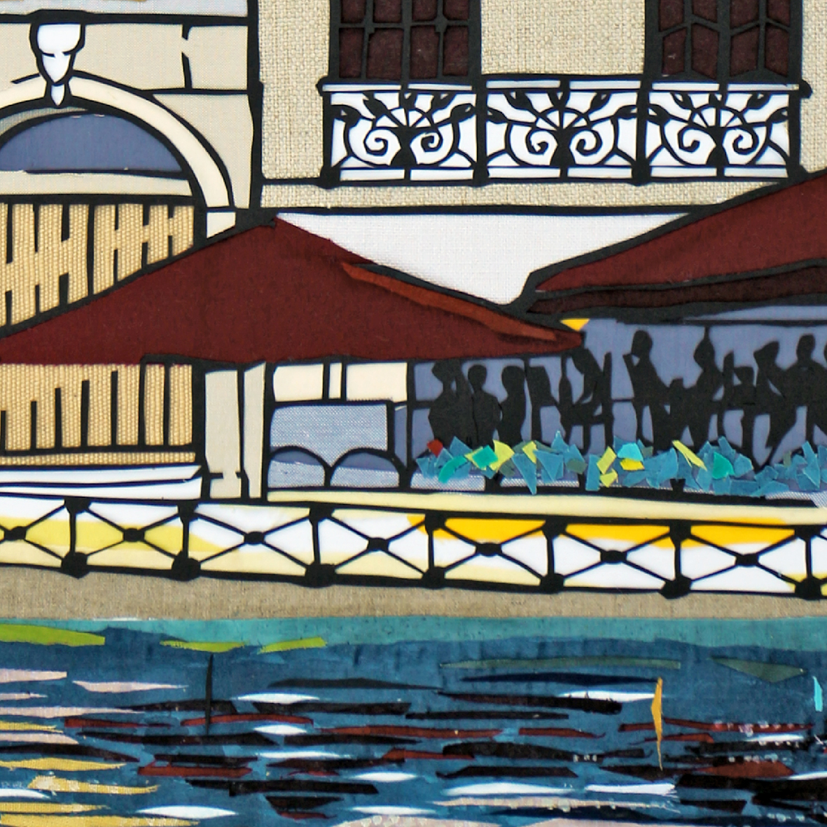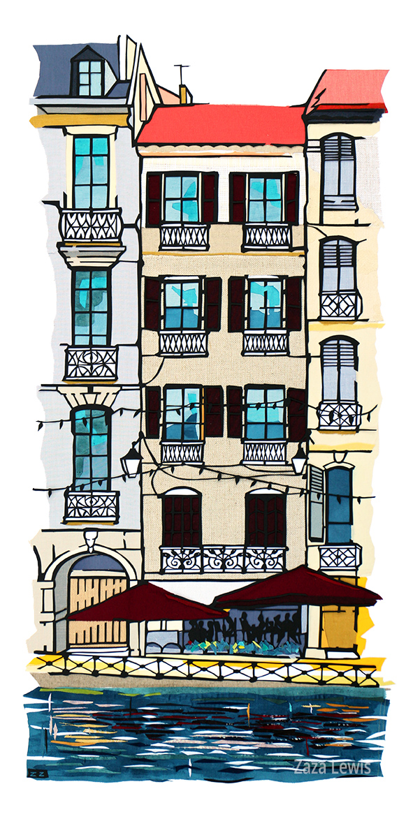 This was inspired by the lively town of Bayonne on the South west of France, where 2 rivers join just before the Atlantic Ocean. The tall narrow houses are particularly of interest, full of character.
