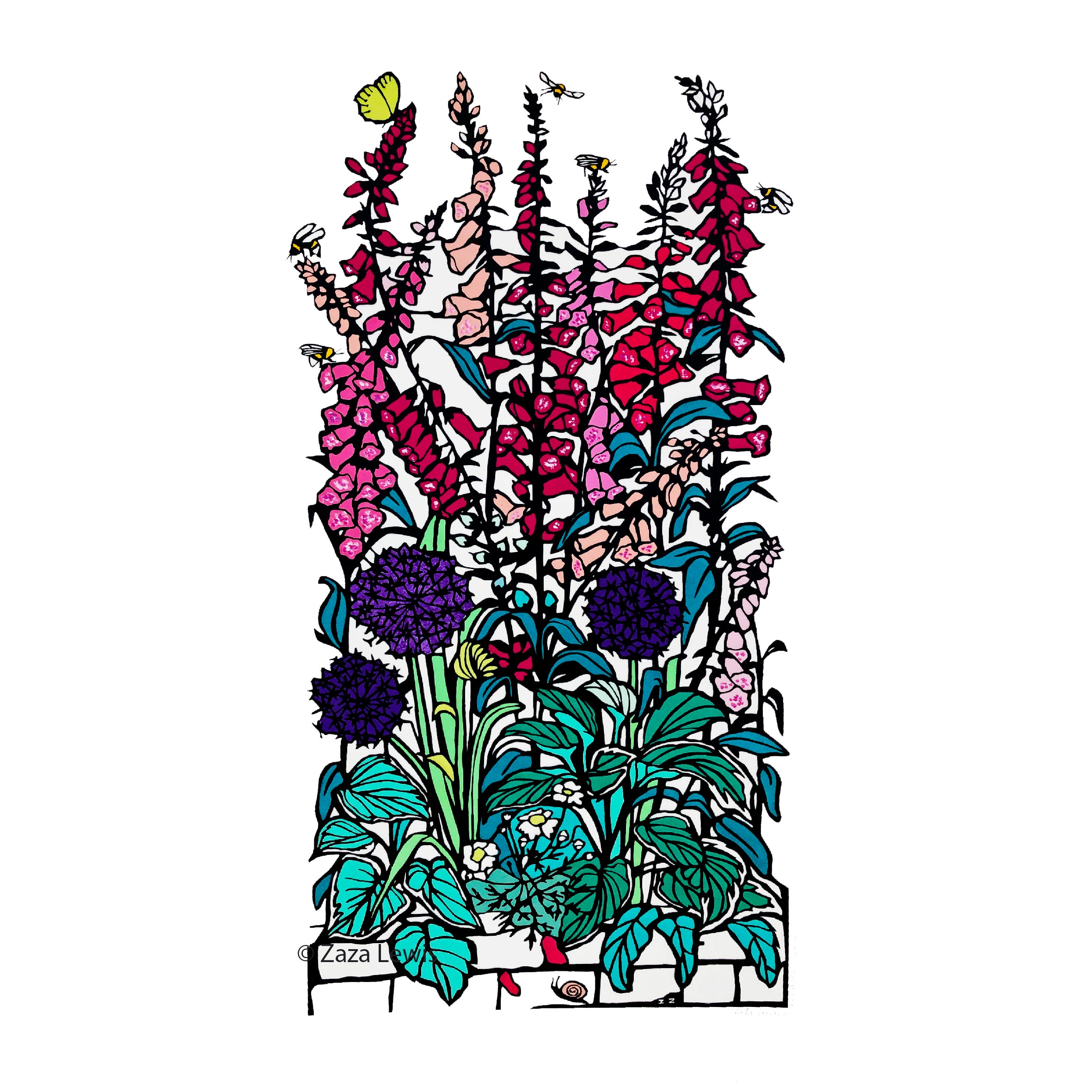 Foxgloves, alium, hostas, bees, butterflies and snails.